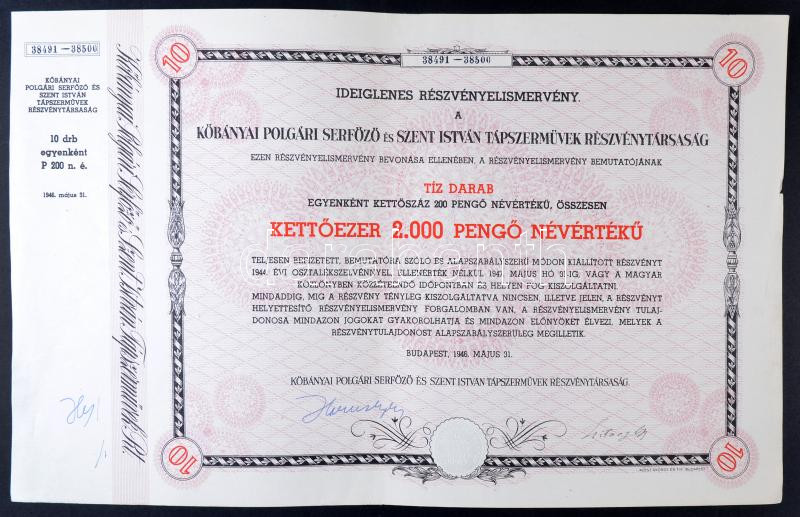 Budapest 1946. "Kőbányai Polgári Serfőző és Szent István Tápszerművek Részvénytársaság" 2000P-ről szóló ideiglenes részvényelismervénye T:II-