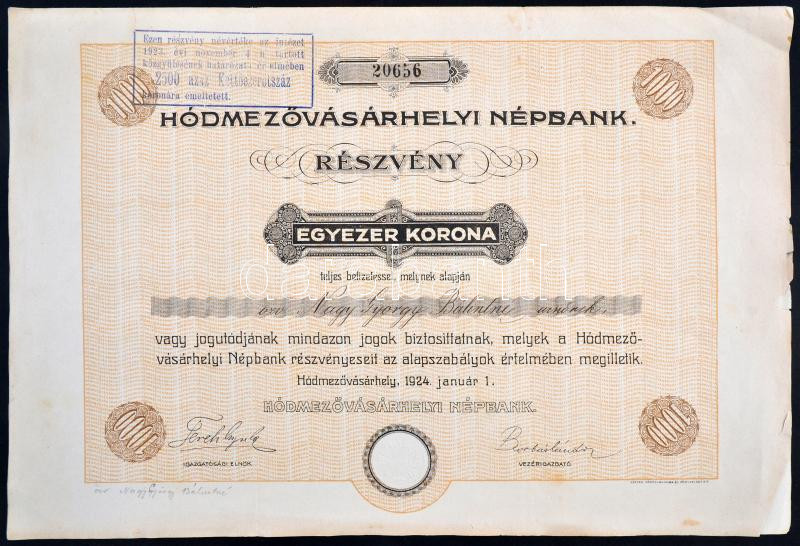 Hódmezővásárhely 1924. "Hódmezővásárhelyi Népbank" részvénye 1000K-ról...