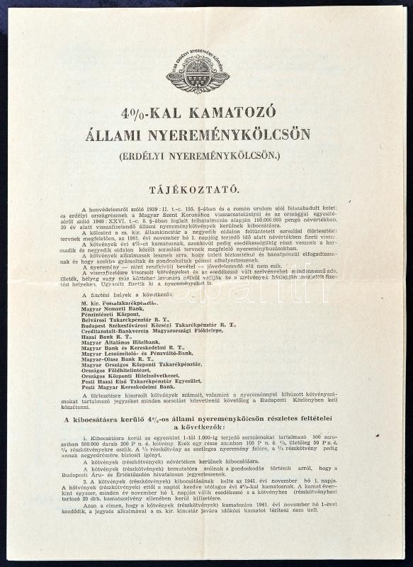 Kőszeg 1941. "4%-kal kamatozó állami nyereménykölcsön" (erdélyi nyerem...
