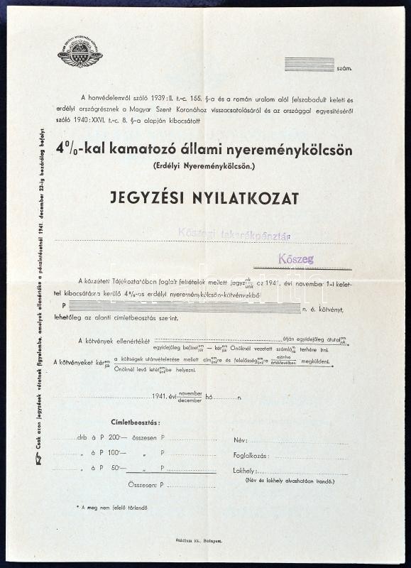 Kőszeg 1941. "4%-kal kamatozó állami nyereménykölcsön" (erdélyi nyereménykölcsön) tájékoztató és jegyzési nyilatkozat T:III