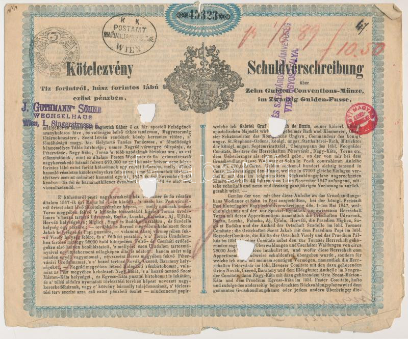 Torna 1847. "Kötelezvény" 10Ft-ról, 20Ft-os lábú ezüst pénzben, bélyeg...