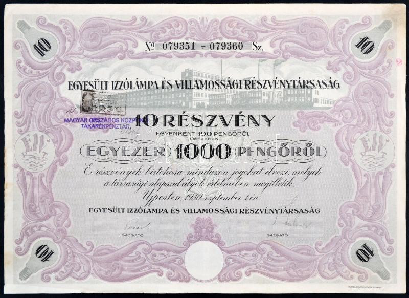 Újpest 1930. "Egyesült Izzólámpa és Villamossági Részvénytársaság" 10 részvénye összesen 1000P-ről szelvényekkel, bélyegzésekkel T:III