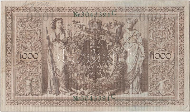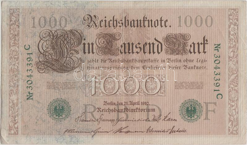 Német Birodalom 1910. 1000M (5x) hétjegyű sorszám, zöld pecséttel T:II... https://www.darabanth.com/en/227-Online-auction/227.0/Numismatics/Worldwide-banknotes~600012/Nemet-Birodalom-1910-1000M-5x-hetjegyu-sorszam-zold-pecsettel-TII-III-3Cbr3EGerman-Empire~II1007762