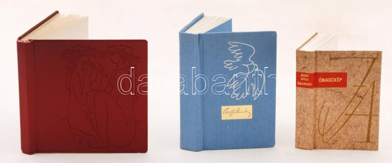 Description: 3 db minikönyv: Reich Károly: Variációk. Devecseri Gábor versével. Kiadói műbőr kötés, jó állapotban.; József Attila: Önarckép. Bp., 1975, Kossuth Könyvkiadó. Kiadói kartonált kötés, jó állapotban; Petőfi Sándor. Bp., Képzőművészeti Alap Kiadóvállalata. Kiadói egészvászon kötés, szép állapotban.