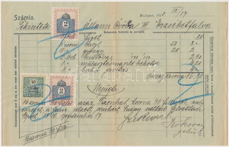 1865 Bp. VII., Sziklai J. és Fia Utóda Papír- és tanszerkereskedésének díszes fejléces számlája 2x2f és 10 f okmánybélyeggel