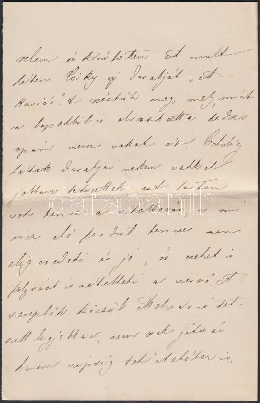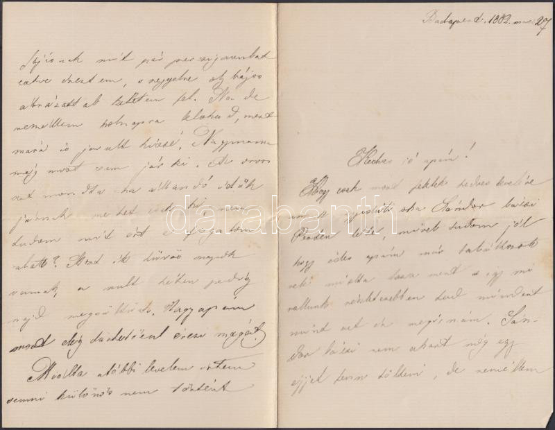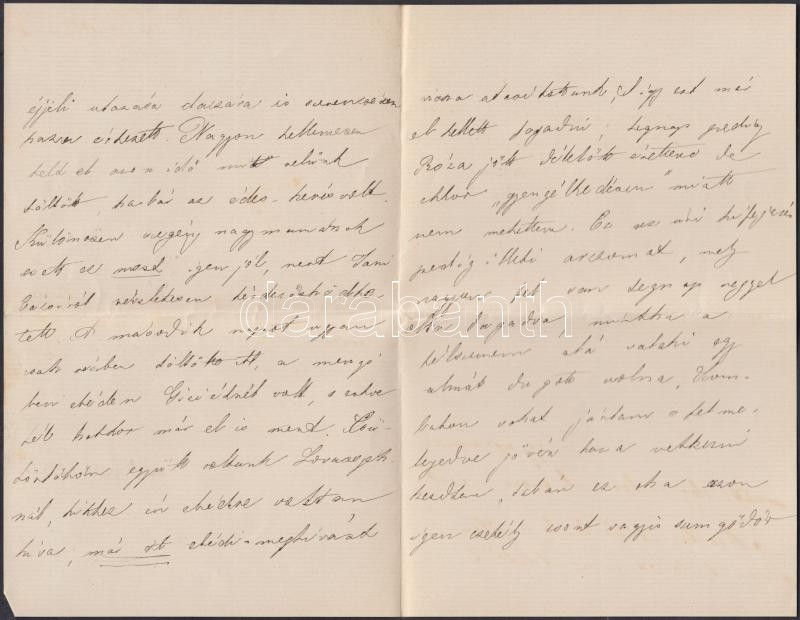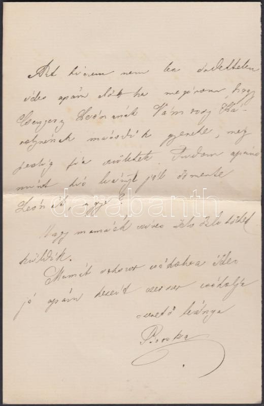 1882 Széll Piroska (1865-1886), Arany János menyének levele apjának, Szél Kálmán nagyszalontai esperesnek, amelyben különféle aktuális eseményekről számol be: ismerős (családtag?) látogatásáról, kisebb betegségéről, színházlátogatásról, stb., borítékban, postán elküldve