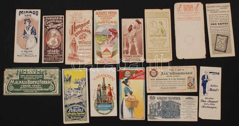 XX. század eleje, reklám számoló cédulák: Élelmiszereket, italokat reklámozó cédulák, vegyes minőségben, 15db / counting slip