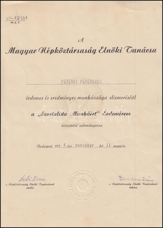 1954 Dobi István (1898-1968), Magyarország korábbi miniszterelnöke (1948-1952), ekkoriban az Elnöki Tanács elnöke (1952-1967) és Darabos Iván, az Elnöki Tanács titkára (1953-1956) aláÃrásai a Magyar Népköztársaság Elnöki Tanácsának "Szocialista Munkáért" Érdemérem kitüntetést adományozó oklevelén