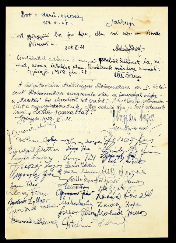 Description: 1959 özv Medgyessy Ferencné Kossuth díjas kiváló szobrászművész özvegye, Soós Gyula művészettörténész saját kezű beírása és aláírása emléklapon. A hátlapon Krajcsi Lajos karmester beírása és aláírása és a Salgótarjáni Acélárúgyár fúvós zenekara 34 tagjának aláírása