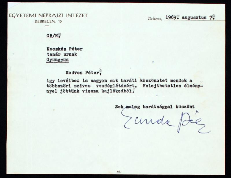 1969 Dr Gunda Béla Herder-díjas néprajztudós egyetemi professzor saját kézzel aláírt levele