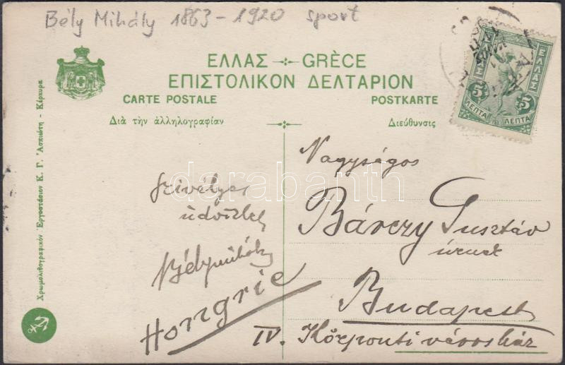 Description: Bély Mihály(1863-1920) vívó, testnevelési szakfelügyelő, az Országos Testnevelési Tanács előadó tanácsosának üdvözlő sorai és aláírása az 1906-os athéni olimpiáról hazaküldött képeslapon, rajta a stadion képével Bárczi Gusztáv(1890-1964)orvosnak címezve