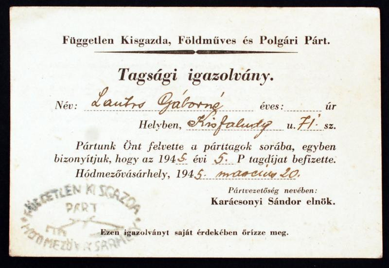 1945 Kitöltött Független Kisgazdapárt tagsági igazolvány