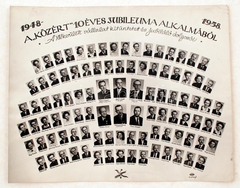1958 A KÖZÉRT 10 éves jubileuma alkalmából kitüntetett XIV. kerületi dolgozók kistablója 99 nevesített portréval, 24x30 cm
