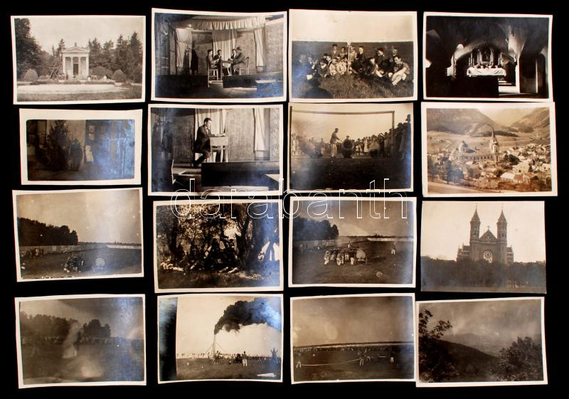 cca 1920-1930 Vegyes fotók, benne érdekességekkel: cserkészekről, tűzoltókról, Kazinczy Ferenc emlékére épített széphalmi emlékcsarnokról, színpadi jelenetekről, ismeretlen tájakról, 7,5x4,5 és 8,5x6 cm közötti méretekben
