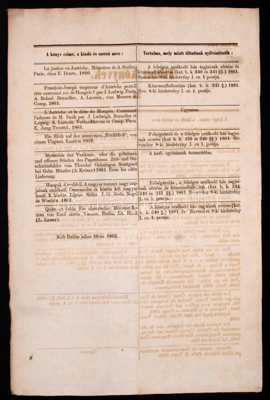 Description: 1863 Buda, A cenzúra által kiadott tiltott könyvek listája, a felsorolásban szerepel Széchenyi István 1857-ben névtelenül kiadott "Ein Blick auf den anonymen Rückblick" című műve
