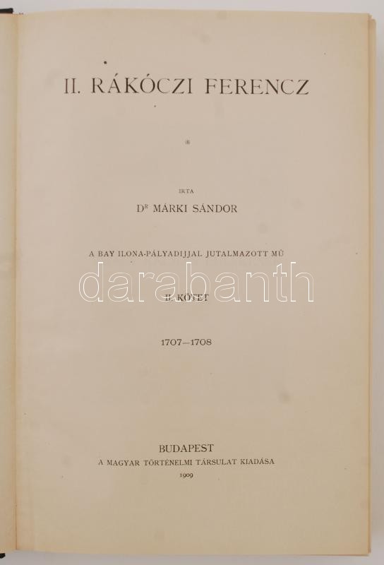 Márki Sándor dr.: II. Rákóczi Ferenc. Magyar Történeti életrajzok. A Bay Ilona-PállyadÃjjal jutalmazott mű. II. kötet. 1707-1708. Budapest, 1909, A Magyar Történelmi Társulat. Újrakötött félvászon kötésben, jó állapotban.