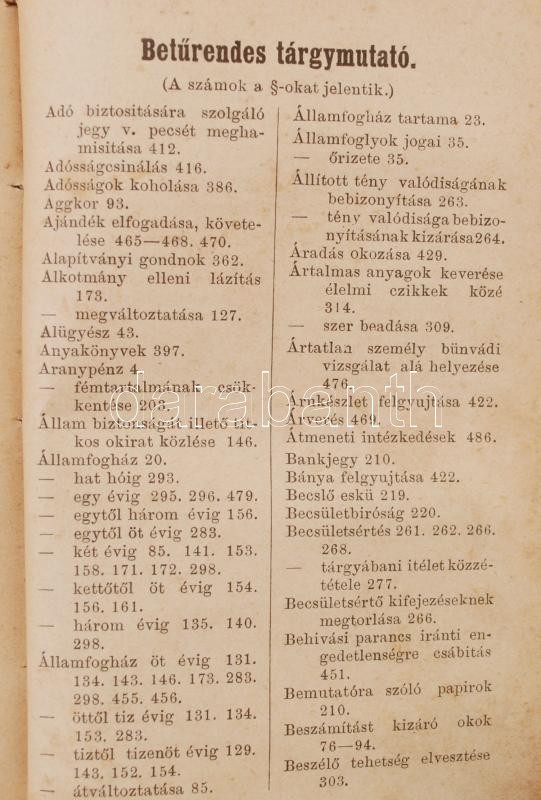 Description: [Csemegi Kódex] Az 1878: V. Törvényczikk a Magyar Büntető Törvénykönyv. A büntettekről és vétségekről. Kiegészítve a rávonatkozó törvényekkel és curiai határozatokkal valamint betürendes tárgymutatóval. Budapest, 1889, Eggenberger-féle Könyvkereskedés. Kissé viseletes félvászon kötésben.