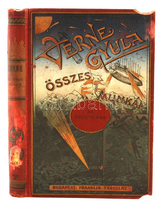 Verne Gyula: Az úszó város. Ötödik egyedül jogosított képes kiadás. Első kiadás! Bp., é.n., Franklin-Társulat. Illusztrált, kiadói aranyozott, festett egészvászon kötés, Kopottas fedőlap,lyukas gerinc, ill. sarok, egyébként jó állapotban.