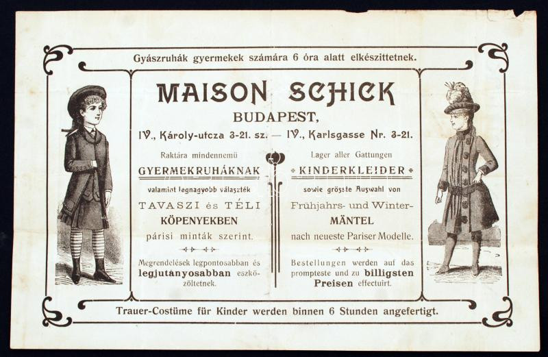 1904 Bp.IV-VI., Maison Schick Gyerekruha Szabóságának díszes fejléces ...