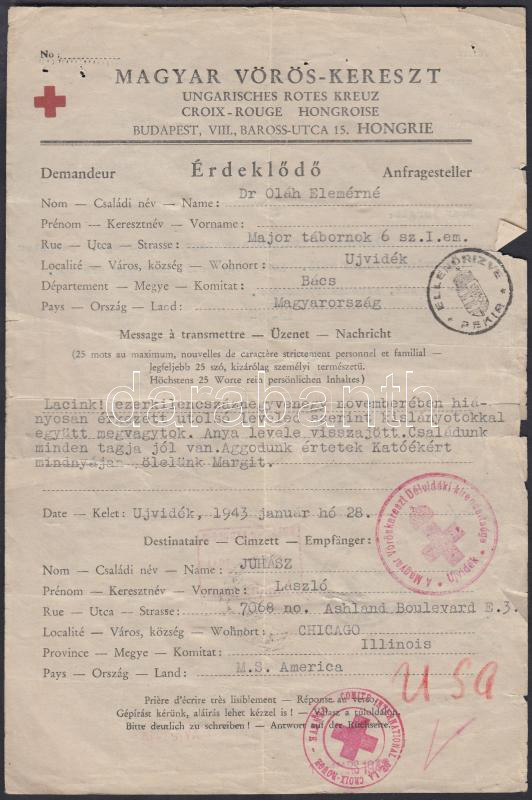 1943 Újvidék, A Magyar Vöröskereszt kitöltött, az Egyesült Államokba c...