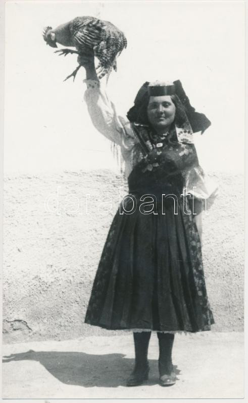 Description: 1926 Kerny István (1879-1963): Csököly, lakodalmas menet, elől a nászasszony, kezében a férfit jelképező kakas, ezt a kakast a házasok lakhelyének küszöbén aztán áldozatul levágták…, 2 db későbbi nagyítás (hátoldalán néprajzi leírással) a szerző hagyatékában levő negatívokról, 11x8 cm és 12x17 cm