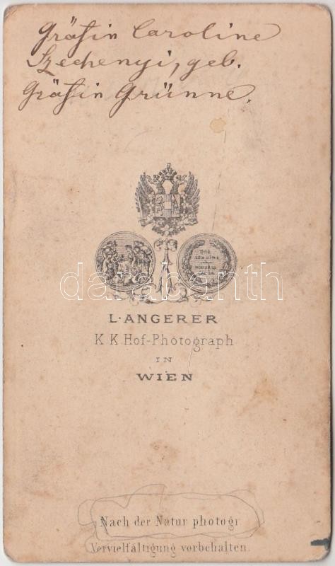 Description: cca 1865 Gróf Széchenyi Karolina, született gróf Grunne (egy másik fotón Grünne), Angerer bécsi műtermében készült viztitkártya méretű, keményhátú fénykép, feliratozva, 10,5x6 cm