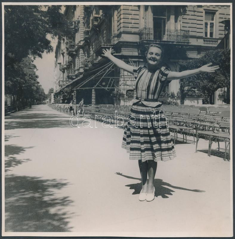 cca 1938 Rácz Vali (1911-1997) színész- és énekesnő a Duna korzón, Rozgonyi felvétele, 17,5x17,5 cm