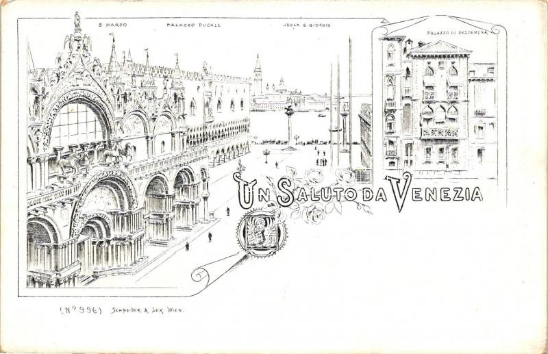 Description: Venice, Venezia; S. Marco, Palazzo Ducale, Isola S. Giorgio, Palazzo di Desdemona / cathedral, palaces, island, floral Art Nouveau, Schneider & Lux No. 996.