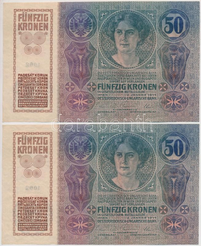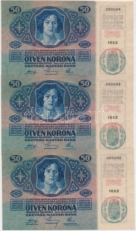 Hungary 1914. 50 Korona (3x) sequenteial serials C:AU,XF