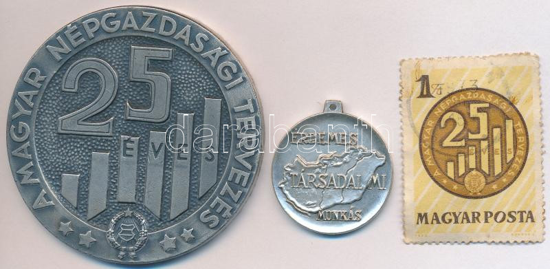 1972. "A Magyar Népgazdasági Tervezés 25 éves / 1947-1972" fém plakett (60mm) + DN "Érdemes Társadalmi Munkás" fém emlékérem füllel (28mm) + "A Magyar Népzgazdasági Tervezés 25 éves" bélyeg T:2