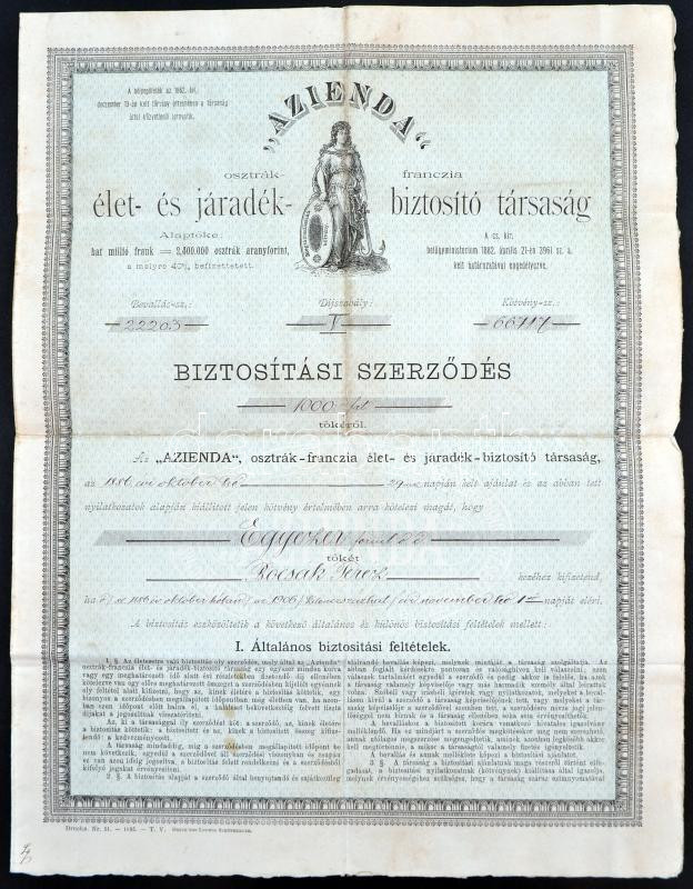 Description: Ausztria / Bécs 1886. "'Azienda' Osztrák-Franczia Élet- és Járadék-Biztosító Társaság" biztosítási szerződése 1000Ft-ról magyar nyelven T:III
