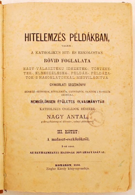 Description: Nagy Antal: Hitelemzés példákban, vagyis: a katholikus hit- és erkölcstan rövid foglalata. 3. köt. Komárom, 1886, Ziegler Károly. Kicsit kopott félvászon kötésben, egyébként jó állapotban.