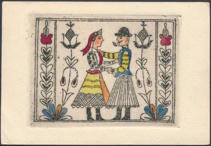 Jelzés nélkül: Táncoló pár. Színezett rézkarc, papír, 8x11 cm