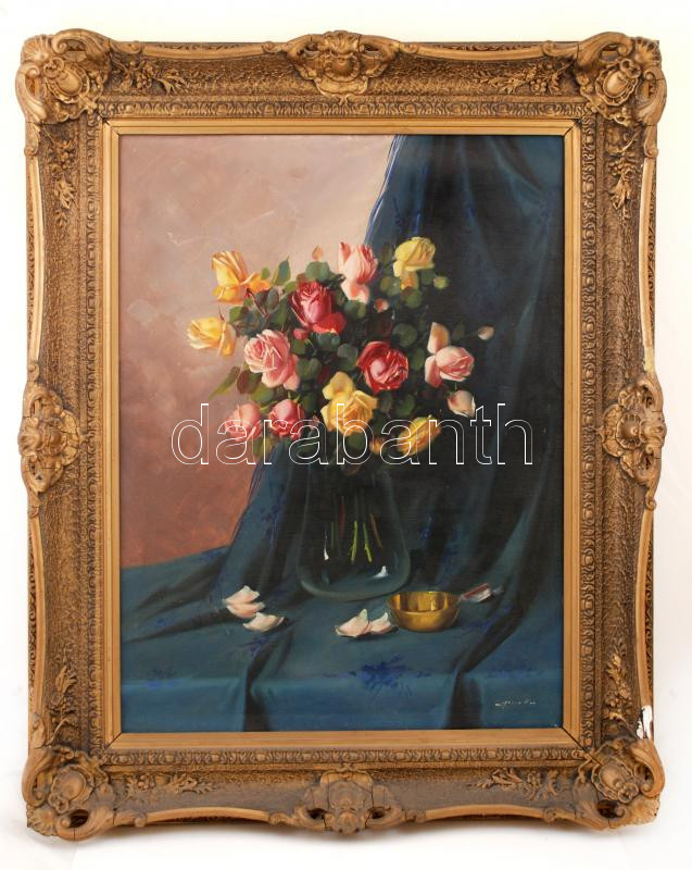 Murin Vilmos (1891-1952): Virágcsendélet. Olaj, vászon, jelzett, vászon apró sérülések, antik sérült keretben, 80×60 cm