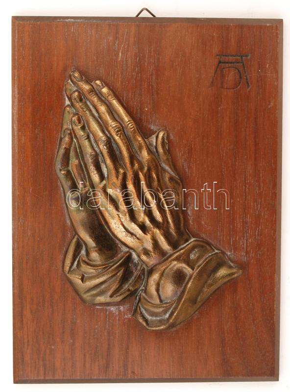 Imádkozó kezek, Albrecht Dürer rajza alapján készült modern bronz kisplasztika, fa lapon, jelzés nélkül, 20×15 cm