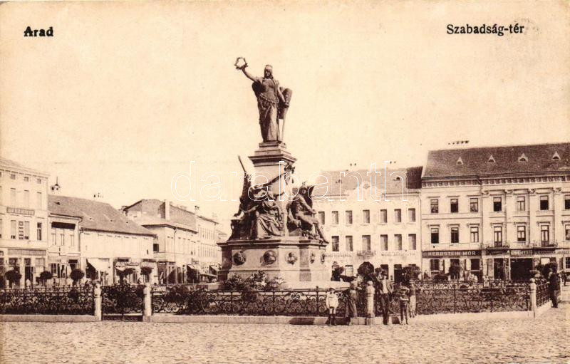 Arad, Szabadság tér, Herbstein Mór, Frischmann József, Weigl Adolf, Schwarz testvérek és Hubert J. üzlete, Vértanú szobor / square, shops, statue