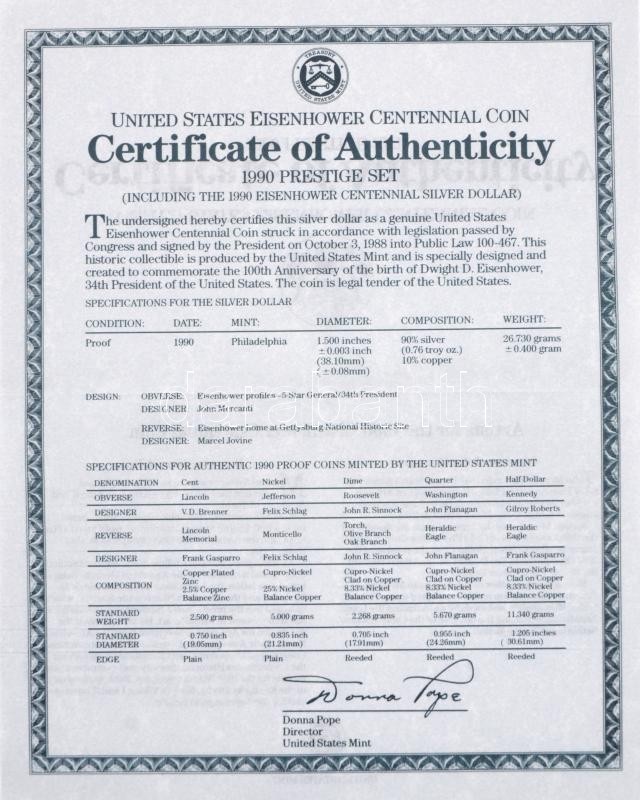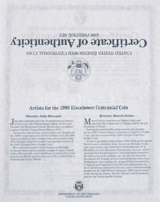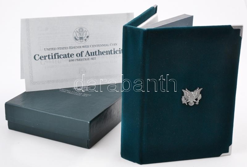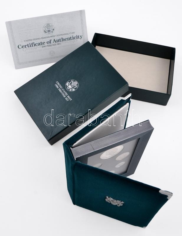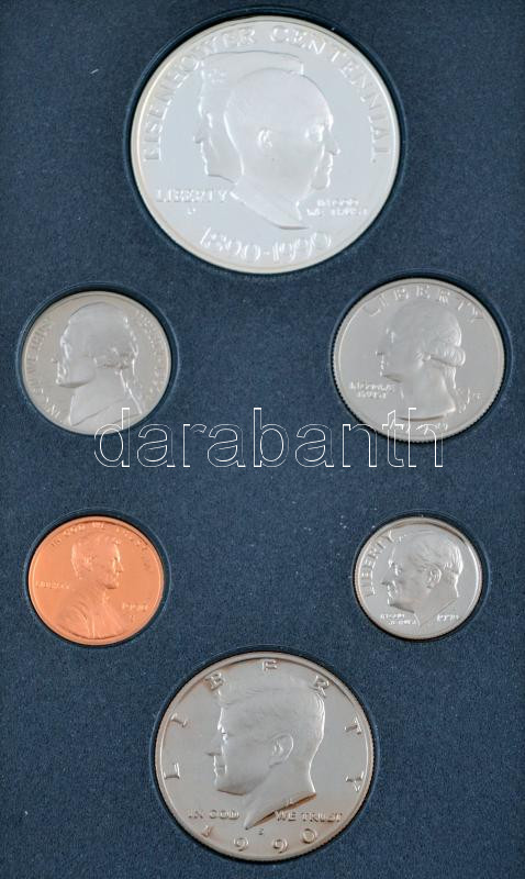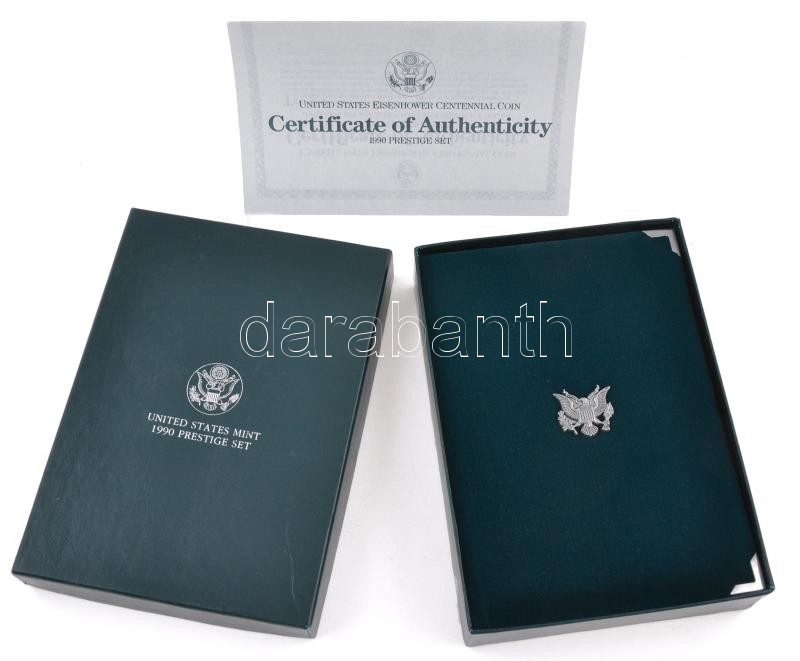 Description: Amerikai Egyesült Államok 1990. 1c-1$ (6xklf) "Presztízs" szett, benne 1$ Ag "Eisenhower centenárium", eredeti bársony díszdobozban, tanúsítvánnyal, papírtokkal T:PP