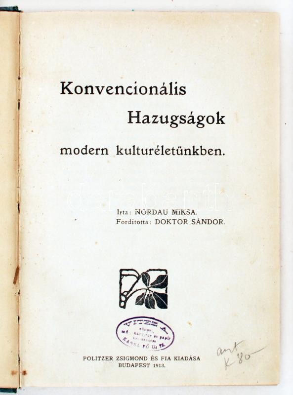 Nordau, Miksa: Konvencionális Hazugságok modern kultúréletünkben. Bp.,... https://www.darabanth.com/en/231-Online-auction/231.0/Other-collectibles/Books-Other-rarities~600041/Nordau-Miksa-Konvencionalis-Hazugsagok-modern-kultureletunkben-Bp-1913-Politzer-Zsigmond-~II1014794