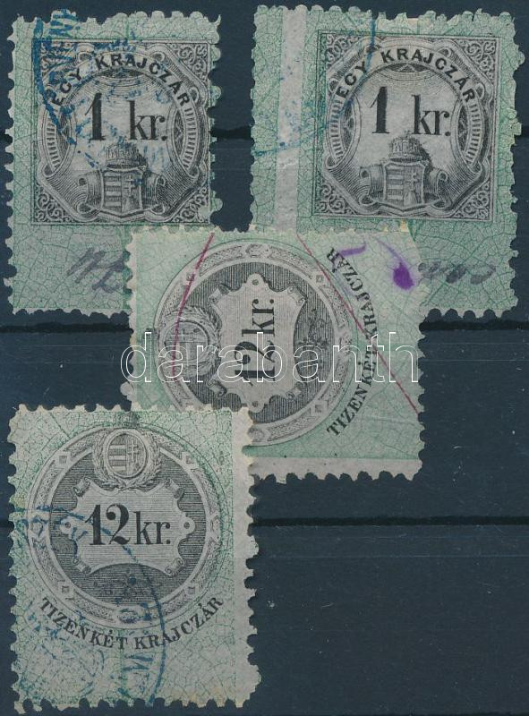1870 Okirati illetékbélyeg 2 x 1kr, 2 x 12kr elfogazás és három pólyás
