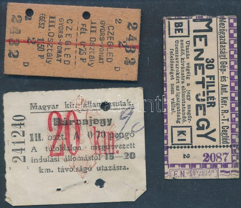 cca 1920-1930 3 db menetjegy(Mezőgazdasági Gép- és Aut.Ker. Rt. Cegléd, Cegléd gyorsvonat, Magyar Királyi Államvasutak bárcajegy)