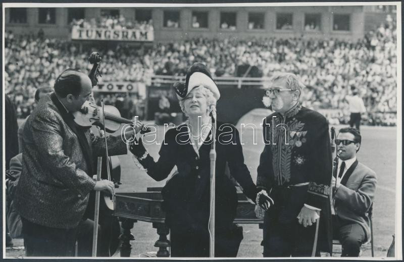 cca 1967 Honthy Hanna (1893-1978) énekel egy sportstadionban, mellette Csákányi László (1921-1992) színész látható, 12x18 cm