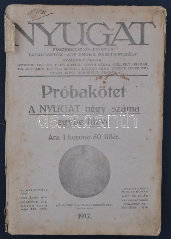 https://www.darabanth.com/en/231-Online-auction/231.0/Other-collectibles/Printed-Materials~600027/1917-A-Nyugat-cimu-folyoirat-probakotete-negy-szam-egybefuzve-benne-Kaffka-Margit-Moricz~II1048607