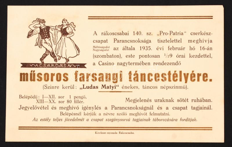 1935 Meghívó a rákoscsabai 140. sz. "Pro-Patria" cserkészcsapat Parancsnoksága által rendezett műsoros farsangi táncestélyére