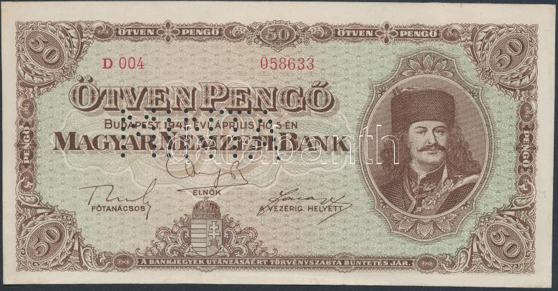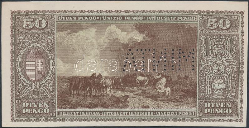 Description: 1945. 50P "MINTA" perforációval, "D004 058633" sorozat- és sorszámmal (ebből a címletből nem ismert D000 minta bankjegy, csak D004) T:restaurált