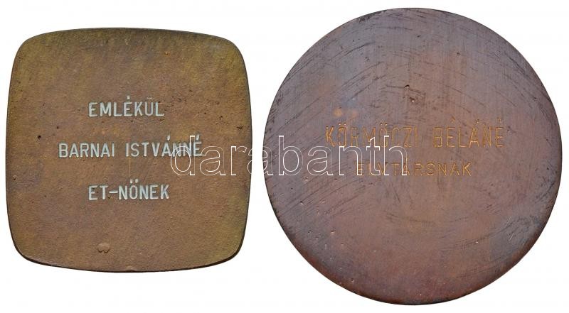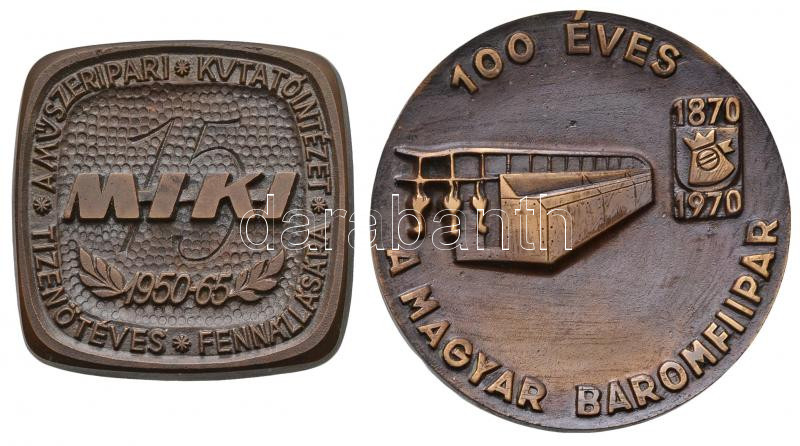 Description: 1965. "Magyar Műszeripari Kutatóintézet tizenöt éves fennállására 1950-65" Br emlékplakett eredeti tokban (59x59mm) + 1970. "100 éves a magyar baromfiipar 1870-1970" Br emlékérem eredeti tokban (72mm) T:1,2
