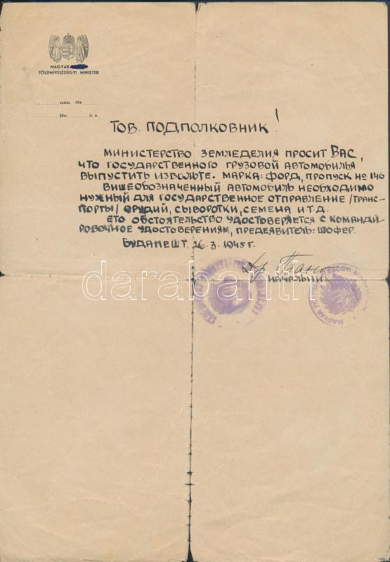 1945 Orosz nyelvű kérvény a Földművelésügyi Minisztériumból szovjet alezredes (podpolkovnyik) részére, "Dr. Bano" aláírással (talán Dr. Bánó J. István, későbbi földművelésügyi miniszteri osztálytanácsos), a minisztérium bélyegzőjével, a hajtás mentén szakadt