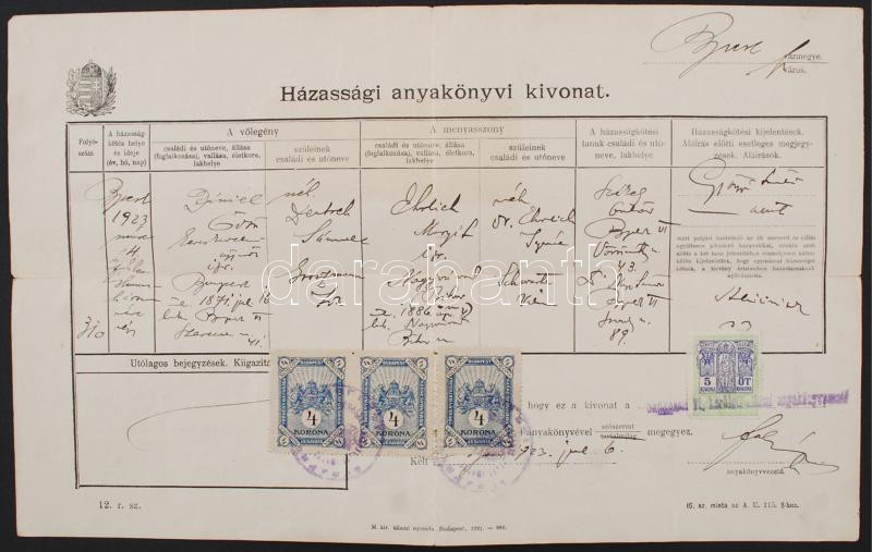 1923 Izraelita vallású személyek számára kiadott házassági anyakönyvi kivonat 3x4 korona és 5 korona okmánybélyegekkel