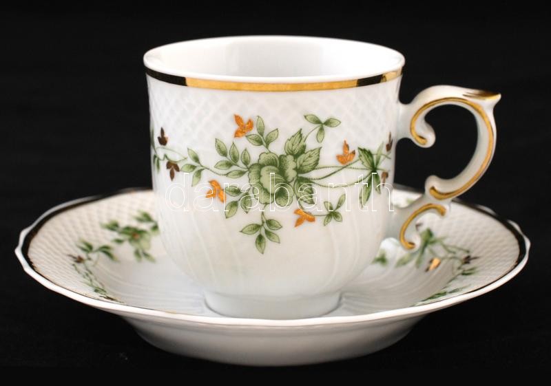 Hollóházi Erika mintás étkészlet és kávéskészlet, matricás, jelzett, hibátlan, étkészlet: 25 db, mokkás: 9 db