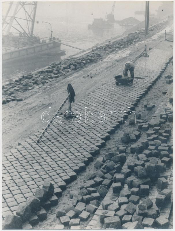 cca 1950 Sinka István: Kövezik a budai rakpartot, a szerző hagyatékában levő negatívról készült későbbi nagyítás, 24x18 cm