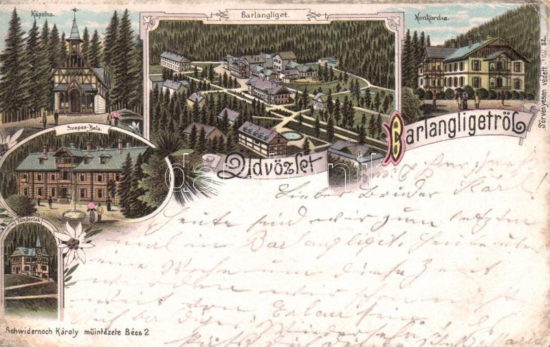 1899 Tátra, Barlangliget, Konkordia, Kápolna, Szepes Béla, Tündérlak / hotels, chapel, floral Art Nouveau litho (EB)